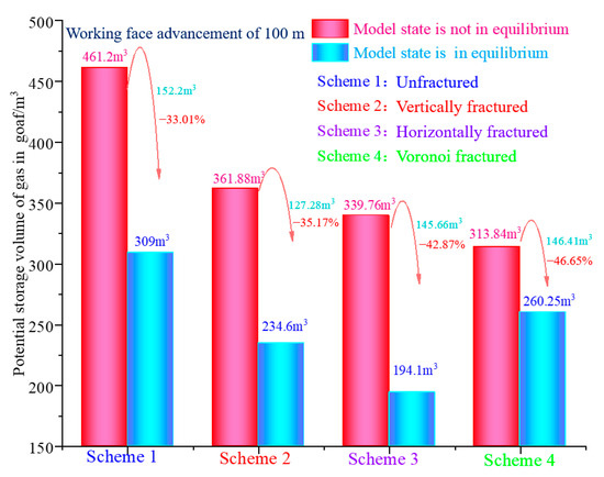 The simulation results were analyzed and processed by the binarization method mentioned in Section 4.2 above. When the main roof was not treated and the working face advanced by 100 m, the main roof became broken for the first time. The volume of the blank part of the goaf before and after the break was reduced from 461.2 m3 to 309 m3, a decrease of 33.01%. At this time, the reduced volume (152.2 m3) could be regarded as the main source of gas overrun in the initial mining stage of the working face. When the main roof was treated with vertical fracturing, horizontal fracturing, and Voronoi fracturing, respectively, the strength of the main roof was weakened, the bearing capacity decreased, the main roof was broken when the working face advanced by 80 m, the overburden fracture developed, and the gas migration channel and gas enrichment area were initially formed. The volume change of the blank part of the goaf when the working face advanced by 80 m and 100 m under different fracturing schemes is shown in Figure 9.