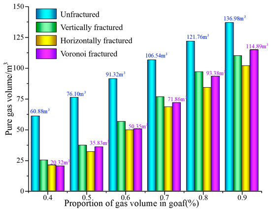 When the gas concentration in the goaf was less than or equal to 60%, the fracture space generated by the migration of the overburden after the main roof fracturing could meet the requirements of storing gas to reduce the gas concentration in the goaf so as to solve the problem of overrun gas in the working face. However, the space volume of overburden fractures was limited. With the increasing gas concentration in the goaf, the alleviation degree of the main roof fracturing on the gas overrun problem of the working face was also weakened, and other measures need to be taken to solve the problem of gas overrun in the initial mining stage. The pure gas volume corresponding to the potential gas disaster of the four fracturing schemes under different gas concentrations in the goaf is shown in Figure 10.