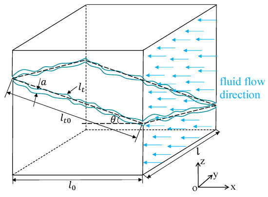 where DTf is the fractal dimension of the tortuosity of the fracture; θ is the fracture dip angle (unit: °); and lt0 is the projection length of the fracture on the horizontal plane (unit: m). The fracture unit is shown in Figure 11. When the fracture dip angle θ is , the fracture is approximately a straight line (DTf ≈ 1), at which point lt0 = lt.