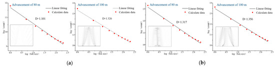 The square box with an edge length r covers the binary map of the development of the overlying soft rock fractures when the working face advances by 80 m and 100 m. By counting the number of square boxes containing fractures and denoting it as N(r), different fractal dimensions can be calculated by continuously changing the value of the box side length r to different non-empty boxes. Then, linear fitting of all the results is performed, which leads to the conclusion that the slope of the straight line is the fractal dimension of the fracture network diagram.