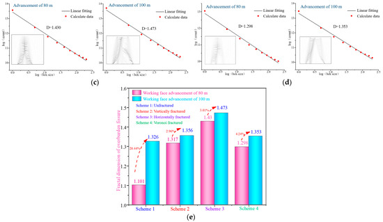 Calculation results of fractal dimension of overburden fracture when the working face advanced by 80 m and 100 m under different schemes: (a) Scheme 1, unfractured; (b) Scheme 2, vertically fractured; (c) Scheme 3, horizontally fractured; (d) Scheme 4, Voronoi-fractured; (e) summary and comparison of the four schemes’ fractal dimensions.