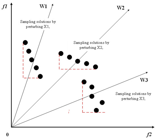 In different detection spaces of the objective space, the contribution degree of decision variables to different objectives may vary. Suppose are the three samples obtained in the three detection spaces, as shown in Figure 1. By analyzing the optimization degree of these samples for the variable , and performing similar calculations for other variables, we obtain the contribution targets of the variable in different spaces: . Therefore, this method can be used to solve the contribution targets in each detection space, ensuring the comprehensiveness and accuracy of the optimization process.