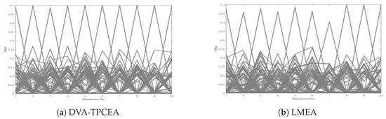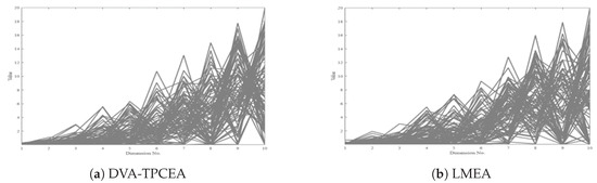 The population parallel coordinate map obtained by LMEA and DVA-TPCEA algorithms on target 10 WFG4 problem.