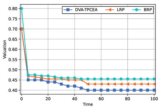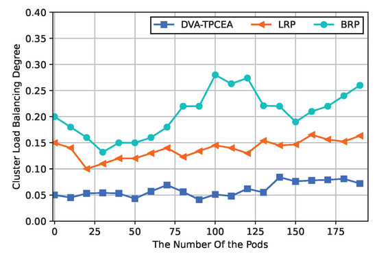 As shown in Figure 6, the comparison of balance among algorithms indicates that the LRP algorithm has a lower balance than the BRP algorithm, while the DVA-TPCEA algorithm shows the lowest balance. This implies that, in terms of resource allocation, the DVA-TPCEA algorithm achieves more balanced utilization, reducing the phenomenon of uneven resource distribution. The LRP and BRP algorithms mainly focus on CPU and memory as resource indicators when deploying Pod applications. This strategy ensures that the number of Pods deployed on each node is relatively even, avoiding situations where some nodes are overloaded while others are idle. However, this simple balance allocation strategy may increase overall resource consumption costs as it does not fully consider the trade-offs and optimization between different resource metrics. In contrast, the DVA-TPCEA algorithm takes more factors into account during resource scheduling. It considers not only conventional resource metrics such as CPU and memory but also factors in resource utilization, resource consumption cost, cluster load, and cluster imbalance. This comprehensive consideration enables the DVA-TPCEA algorithm to more accurately assess the resource status of each node, thereby making more optimized scheduling decisions.