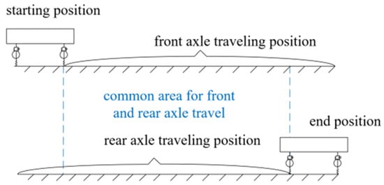 For the whole section of road roughness, the start and end positions of the vehicle are shown in Figure 2. The roughness of the left end of the road for the portion driven by the rear axle only is identified by the rear axle, the roughness of the right end of the road for the portion driven by the front axle only is identified by the front axle, and the portion driven by the common axle is determined by the average of the roughness values identified by each axle, i.e.,
