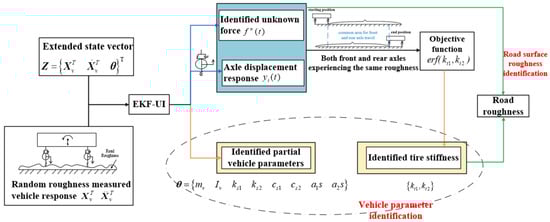 To overcome the above shortcomings of the existing methods, this paper proposes a new method to simultaneously identify vehicle parameters and road roughness based on the extended Kalman filter with unknown input (EKF-UI), considering the idea that the front and rear axles of a moving vehicle pass through the same road roughness. The measured moving vehicle is modeled as a four-degree-of-freedom semi-vehicle model with front and rear wheels. In view of the coupling effect between axle stiffness and road roughness, which cannot be identified simultaneously, other unknown vehicle parameters except tire stiffness are extended to the state vectors, and the unknown force on the vehicle is defined as the product of the relative displacement between tire and road roughness and tire stiffness. The vehicle physical parameters and the unknown force on the front and rear axles of the vehicle are identified by EKF-UI. Then, the simultaneous equation of front axle position roughness and delayed rear axle position roughness is established, and the axle stiffness is estimated by the nonlinear least squares method. Finally, the roughness surface profile at the front and rear axle positions can be estimated and the roughness of the whole road section can be obtained. The effectiveness of the proposed method is verified by numerical verifications of different roughness grades, different noise levels, and different vehicle speeds.