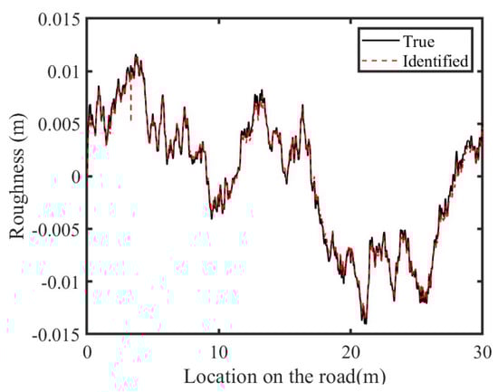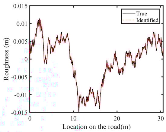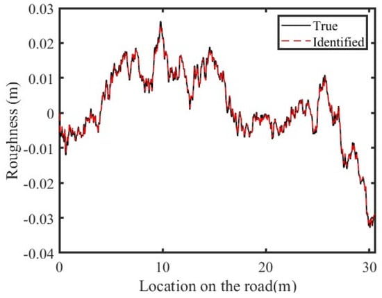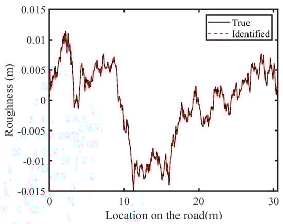 Because the vibration of the vehicle engine generates noise, the impact of noise is therefore included in numerical simulations. Recognition under different noise levels was investigated by previously considering Gaussian white noise with 5% RMS, so in this section, the recognition results will be investigated under noise levels with 10% RMS. The parameter settings are kept the same as in Section 3.1, and the road at class B roughness is studied and discussed.