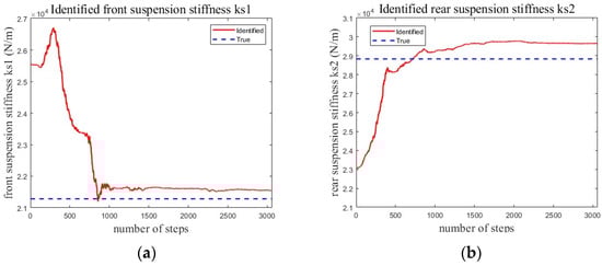 Convergence of some of the parameters (at Class B roughness). (a) Front suspension stiffness ks1; (b) rear suspension stiffness ks2.