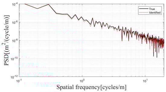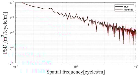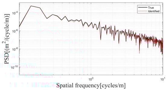 Compared to 5% noise level, the recognition error of roughness spatial contour increases to 4.75% at 10% noise level as shown in Figure 10 for the same Class B roughness recognition result. At 10% noise level, the identified road roughness PSD is shown in Figure 11, with more pronounced undulations in the high-frequency part compared to the 5% noise level (e.g., Figure 5). The convergence of vehicle body mass and moment of inertia identification under a 10% noise level is shown in Figure 12. In terms of identifying vehicle parameters, as shown in Table 3, the parameters identified based on the extended Kalman filter with unknown input are still accurate, with an error basically within 3%, while at higher noise levels, the accuracy of the unknown force identification decreases slightly, with an error of 8% in the identification of the unknown force on the front axle and an error of 7% in the identification of the unknown force on the rear axle, which results in a slight decrease in the accuracy of identifying tire stiffness, with an error of identification of around 5%. Thus, it can be seen that the method can accurately identify the physical parameters of the moving vehicle and the roughness of the road at a noise level of 10%, but the recognition accuracy is slightly reduced by the noise.