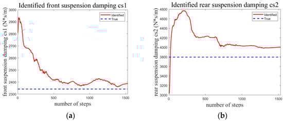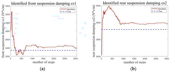 Convergence of some parameters (under 20 m/s vehicle speed). (a) Front suspension damping cs1; (b) rear suspension damping cs2.