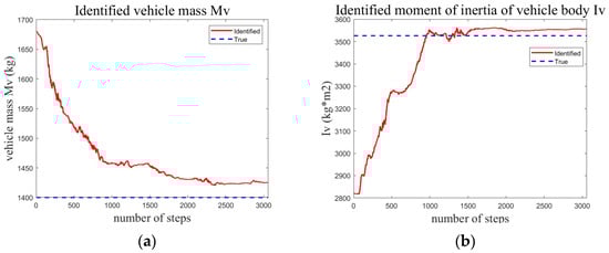 Convergence of some parameters (10% noise). (a) Body mass Mv; (b) body moment of inertia Iv.
