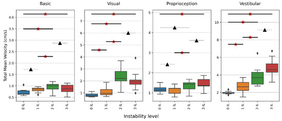 A comparison of velocity (cm/s) of different instability levels (ILs) under different sensory integration strategies (SIS). Lines on top with ★ represent pairs that have statistical significance; lines on top with ▲ represent pairs where we did not find statistical significance. Black-filled ◊ symbols indicate outliers, deviating from the central range.
