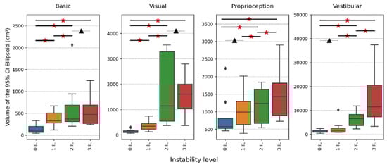 Comparison 95th CI ellipsoid volume (cm3) of different instability levels (ILs) under different sensory integration strategies (SIS). Lines on top with ★ represent pairs that have statistical significance; lines on top with ▲ represent pairs where we did not find statistical significance. Black-filled ◊ symbols indicate outliers, deviating from the central range.
