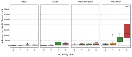 Upon arranging the median volumes of the chest movement’s 95th CI ellipsoid across different combinations of IL and SIS, from the smallest to the largest (Figure 9), it is observed that, as the volumes increase, the velocities follow suit. Increases in both velocity and volume occur gradually at first but, towards the larger end of the graph, both values start rising much more steeply. The most dramatic increase in both velocity and volume is observed in the following combinations: 3IL—Proprioception, 1IL—Proprioception, 3IL—Visual, and 3IL—Vestibular. Thus, more voluminous chest movements also tend to be faster, especially at higher instability levels or under specific sensory strategies.