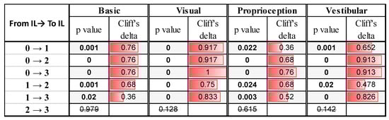 Additionally, the study’s findings indicate that the body’s postural control can be maintained effectively with certain combinations of IL and SIS, such as 2IL-Visual and 2IL-Proprioception. Despite the differing amounts of sensory input in these strategies, the effects on postural control are similar. These findings suggest that, in the event of sensory deficits, healthy individuals can substitute other sensory information to support postural control [31,32].