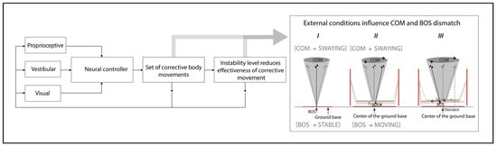 Principle of interaction of sensory information and instability level. The gray area (I) represents COM (center of mass) and BOS (base of support) movement while standing on a stable base.