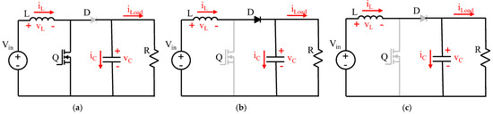 Switching states of a boost topology; (a) MOSFET on in CCM; (b) MOSFET off in CCM; and (c) MOSFET off in DCM.