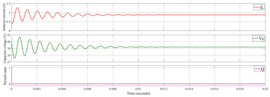 Due to the difficulty in discerning the details of the signals directly from the ILA, the data are extracted in .csv format and subsequently plotted in MATLAB, providing a clearer visualization of the results, as seen in Figure 13. Figure 13 demonstrates that the output voltage closely reaches the target of 60 V, exhibiting no deviation and a stable response. The ripple in the output voltage can be decreased by reducing the sampling step of the controller, depending on the practical limitations of the converter and the power rate. Additionally, the inductor current is maintained around 2 A, ensuring adequate power to sustain the output voltage at the desired 60 V. This precise current control enables the system to effectively adapt to the initial load of 45 Ω. Despite the clarity of steady-state performance, this figure does not capture the dynamic behavior of the controller, as it emphasizes steady-state rather than transient responses.