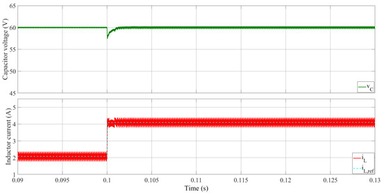 The second simulation illustrates the system’s response to an output voltage reference change, as depicted in Figure 11. At t = 0.1 s, a step-up change is applied to the output voltage reference, increasing it from 60 V to 80 V. Initially, the output voltage briefly decreases due to the non-minimum phase characteristic of the system, before it increases to reach the new reference value. The inductor current responds to the step change much faster, as seen in the simulation results. However, the dynamics of the boost converter cause the output voltage to respond more slowly. Despite this, the transition occurs without any significant overshoot, and the transient lasts for about 5 ms. This behavior demonstrates the ability of the proposed dual control strategy to handle non-minimum phase behavior while maintaining stable and accurate voltage regulation.