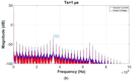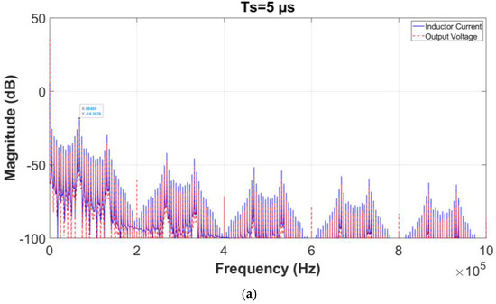 The correlation between the sampling step and harmonics spectrum is clearly illustrated in the spectra of the inductor current and output voltage in Figure 18. As shown in the subfigures, the amplitude of subharmonics is significantly larger when a sampling step of 5 µs is used compared to 1 µs. Increasing the Ts results in additional low-frequency subharmonics that may negatively affect system stability and performance. The maximum achievable switching frequency () is determined by the relationship given by (9); therefore, with Ts set to 5 µs, the is limited to 100 kHz. However, in this application, switching generally follows a pattern of one on-cycle followed by two off-cycles, a behavior attributed to the differing slopes of increasing and decreasing current, as described by (3). This results in a more commonly observed switching frequency of approximately 1/(3·Ts). Consequently, with Ts = 5 μs, the main harmonic appears at 67 kHz (displayed as 68 kHz due to resolution limitations), while reducing Ts to 1 µs shifts this primary harmonic to around 333 kHz (observed as 342 kHz). This shift to higher frequencies with reduced Ts allows for more effective filtering by the converter, enhancing performance by mitigating low-frequency subharmonics and stabilizing the system.