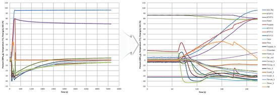 As a preprocessing step, we exclude independent variables with missing values and inconsistent overlapping variables, yielding 21 independent variables, the time variable, and the dependent variable. In addition, the hydrogen refueling is typically complete within 5 min, whereas each sample in real data [11] contains values collected over an hour, including the state of full charge. These values are mostly redundant. Since the redundant and unbalanced data can cause unstable learning or overfitting problems, we discard the values collected after the maximum charging to remove redundant data as shown in Figure 1.