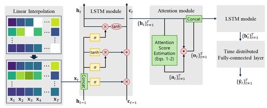 where W and are the trainable parameters, and ⊙ is the element-wise product. Here, the attention mechanism allows the proposed model to prioritize primary features to improve the robustness and reliability of the prediction results. Next, we concatenate with and fuse them through the additional LSTM module to further refine the temporal representation, yielding . We predict the output sequence given by