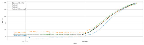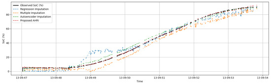 We compare the proposed AHRI model with regression, multiple, and autoencoder-based imputation methods. In this test, we generate 20 erroneous samples by randomly excluding elements of the observed samples at error rates of 20% and 40%, respectively. Here, if even one value of the independent variable is discarded, the corresponding value of the dependent variable is also omitted. Then, imputation methods fill in missing values with their estimated values. In Table 2, the proposed method outperforms the existing algorithms significantly in both metrics. Figure 3 shows the qualitative results, in which the proposed imputation model can effectively fill in the missing values while maintaining the overall flow similar to the observed SoC values.