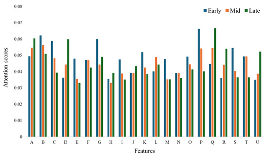 Visualization of attention scores for each feature where a hydrogen refueling sequence is uniformly divided into three subsets: early, mid, and late.