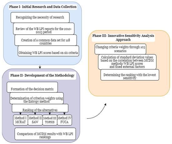 In this section, the proposed MCDM model is applied to a dataset containing LPI information for countries. The flow diagram is presented in Figure 1, and the proposed methodology consists of three main components. In the first stage, the necessity of this study was identified, and the LPI reports published by the World Bank were examined. The number of countries for which the World Bank reports LPI scores varies significantly from year to year. Consequently, a consolidated dataset was developed, encompassing 118 countries for analysis. The data were gathered from the [36], which maintains LPI data from 2007 to 2023. The year 2007 was excluded from the analysis due to a lack of sufficient data. The dataset used for the evaluation process comprises six benefit-oriented criteria (C1: Customs, C2: Infrastructure, C3: International Shipments, C4: Logistics Competence and Quality, C5: Timeliness, C6: Tracking and Tracing) and 118 alternatives. The LPI indicators and their descriptions are presented in Table 1. In the second stage of the proposed methodology, the decision matrix was constructed, criteria weights were determined using the Entropy method, and the performance scores of the alternatives were assessed using four different MCDM methods. The MCDM results were compared with the World Bank LPI rankings. In the third stage, an innovative sensitivity analysis approach was applied to define criteria weights across 105 scenarios. The MCDM methods and World Bank LPI rankings were compared with the defined fixed factors, and the standard deviation value based on the obtained correlations was calculated. Subsequently, the ranking with the lowest sensitivity was determined based on these results.