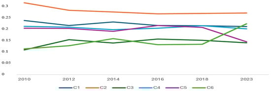 According to the criterion weights determined by the Entropy method, as presented in Table 2 and Figure 2, for all the years covered in this study, the criterion with the highest importance is C2 (“Infrastructure”).