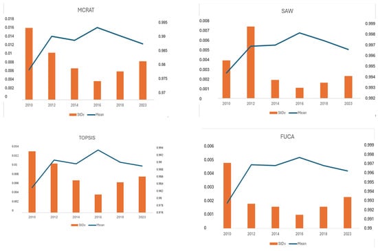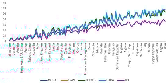 The rankings from MCRAT, SAW, TOPSIS, and FUCA generally differ from the LPI rankings; however, the position of the top-ranked alternative has remained unchanged. Specifically, for the years 2010, 2014, 2016, and 2018, Germany has been the top-ranked country across all methods. In 2012 and 2023, Singapore was the highest-performing alternative in all rankings. The six-year averages of the rankings from the four MCDM methods and the LPI are presented in Figure 3.