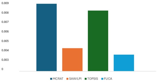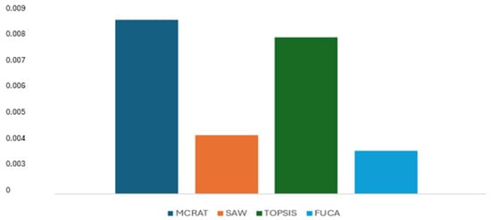 As shown in Table 3, there is a very high correlation between the MCRAT results obtained using different normalization techniques and those without normalization. Moreover, a full correlation was observed between the results generated using the max normalization technique and the non-normalized MCRAT results. A similar situation applies to the other MCDM methods used in this study as well. These findings suggest that, for this study, normalization is not necessary when applying the MCDM methods. In this context, the MCRAT method steps (Equations (7)–(16)) were applied sequentially.