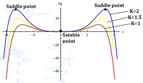 Also, the potential energy function (22) increases with the increasing parameter K, and the abscissa of points of intersection between the potential and the horizontal axis increases with the increasing variable z for z > 0. For z < 0, this situation is reversed.