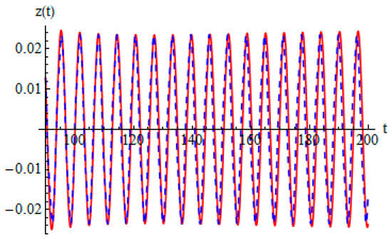 Figure 4, Figure 5 and Figure 6 depict the comparisons between the numerical solution of Equations (11) and (20) for the following resonant case and approximate solutions: (46) on [0, 90], (47) on [90, 200], and (46) and (47) on the domain [0, 200], respectively.
