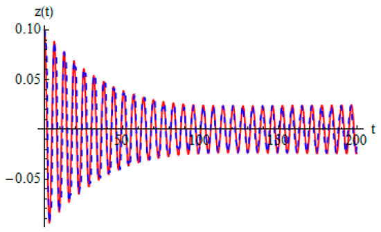 In what follows, since Equation (10) is very difficult to solve, we did not solve it, but from the theory of differential equations [28], the Cauchy method, the method of influence functions, the operator method, and so on, it was more convenient to consider the unknown first approximation z1(t, C1, C2, …,Cn) depending on z0(t) and n(z0(t)). More precisely, we had the freedom to choose the first approximation in the following form: