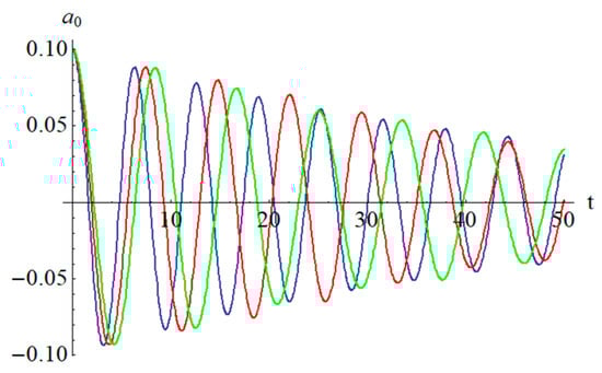 The influence of parameter a0: a0 = 0.001 (blue), a0 = 0.07 (red), and a0 = 0.11 (green).