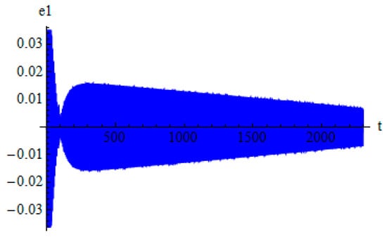 For the sake of simplicity, we consider λi = 1, i = 1, 2, …, 8. For the numerical case, A = 0.1, c = 0.04, k = 2, f = 0.01, a0 = 0.001, δ = 0.02, ε = 0.01, and in Figure 14 and Figure 15, which also depict the errors e1 and e2 given by Equation (69) with θ = 1.
