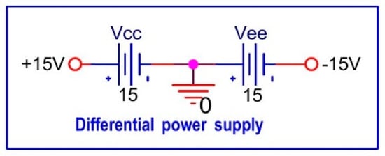 Most operational amplifiers are powered by a double voltage source with opposite polarities and the usual values being +15 V and −15 V. A double source is obtained by connecting two simple DC sources, Vcc and Vee, in series (Figure 16).