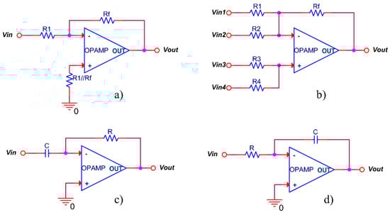 As shown in Figure 17b, the summation of several input signals can be achieved if they are connected to the op-amp inputs, depending on the sign of the input voltage coefficients. By making all resistors equal, the sum (or difference) of the input voltages is obtained.
