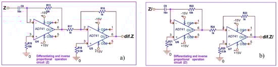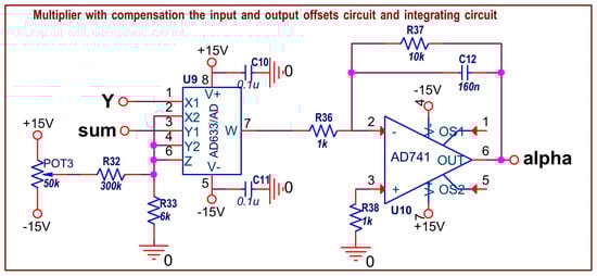 In our approach, for the implementation of the ALPHA function, we designed an electronic circuit composed of AD741 op-amps and passive components, including resistors and capacitors, and an AD633 multiplier with output according to the following catalog specifications: , which is used to generate nonlinear items (where W is the output of the integrated circuit, X1, X2, Y1, and Y2 are the inputs of the integrated circuit, and the amplifier summing node Z allows the user to add two or more multiplier outputs, convert the output voltage to a current, and configure various analog computational functions; in our case, pin 6 is always connected to the ground). To avoid some confusion, it should be mentioned that Z (input of AD633) from the last relationship described has nothing to do with Z from the following, which represents the movement variable from Equation (17).
