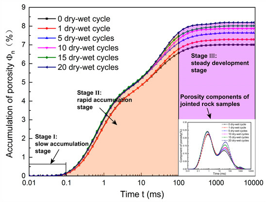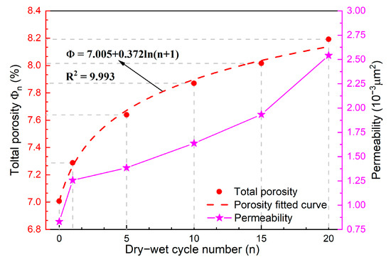 - The dry–wet alternation action can cause the development of the porosity channel, leading to cumulative damage in sandstone. Therefore, the accumulated porosity and permeability of sandstone increase as the wet–dry cycle goes on, and the cumulative porosity goes through the slow accumulation stage, the rapid accumulation stage and the steady development stage.