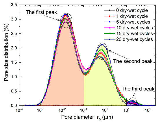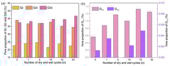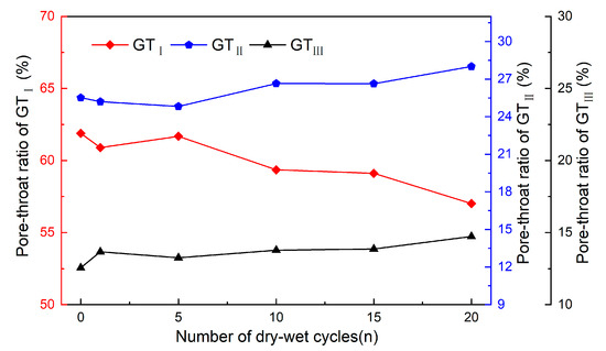 - During the dry–wet alternation process, the dissolution soluble minerals, hydration reaction and uneven shrink increase the size of pores and pore throats. In detail, micropores transform to medium and macropores, while medium pores transform to macropores gradually. The more micropores exist in the sandstone, the more obvious is the transformation from micropores to medium pores. Besides, the proportion of small pore throats decreases gradually, while the proportion of medium and large pore throats increases gradually.