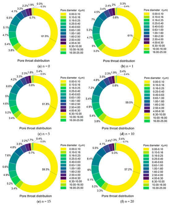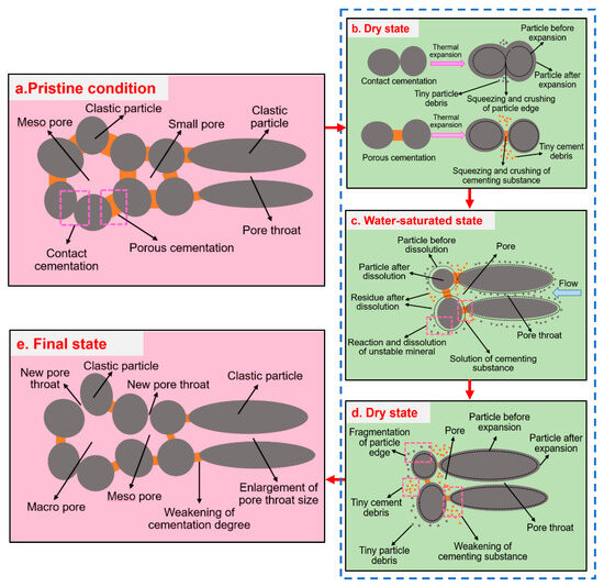 - Final state (Figure 12e). During the dry–wet alternation action, the size of pores and pore throats continues to expand due to the weakening of the cements between mineral particles. The proportion of mesopores and medium pore throats is significantly increased. Besides, the content of soluble minerals and cements in the pores of rock samples decreases continuously due to the erosion of water, so new pores and pore throats are gradually generated under the action of dry–wet alternation [44]. Meanwhile, the cementation effect on the inter-particles gradually decreases during the dry–wet cycle. Ultimately, the micropore morphology and structure change significantly (Figure 4 and Figure 5), resulting in the irreversible cumulative damage of jointed sandstone during dry–wet alternation action.