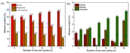 - The contents of feldspar (potassium feldspar and albite), calcite and clay minerals (TCCM) in the test rock samples decreased as the dry–wet cycle went on, which led to the continuous development of pores and pore throats.