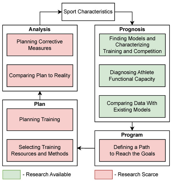 Coaching staff highly seek iterative processes of improvement in sports. Out of the 374 articles related to training in esports, 79 reports were considered the most related to the topic. However, juxtaposing the content of these publications with the “prognosis, program, plan” model, as adapted from [9], a very selective approach was noticed, focused mainly on single parameters or factors that are not a reference to a complete system of training in esports. This iterative system is presented in Figure 4; we include our general experience-based mapping of the available literature in this depiction. This suggests to us that the current state of knowledge on training in esports is underdeveloped. Such a knowledge gap leaves the immense esports industry without the fundamental understanding required to develop future champions.