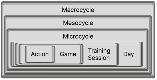 Thirdly, selecting the optimal training load required to reach mastery is essential. According to [81], it takes roughly 10,000 h and at least ten years of training to be an expert in a given activity. Of course, this does not precisely reflect reality, as everything depends on the athlete’s selected sport and other individual features [82]. In sports theory, when viewing training as a process, stimuli are evaluated and planned within a compositional structure, as shown in Figure 5.
