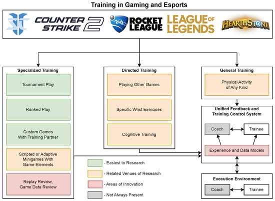 However, some distinct parts of sports sciences are seldom investigated in the context of esports. In traditional sports, topics such as training stages, periodization, stimuli/exercise selection, and control are well defined within the area of sports theory [9,10]. Let us assume that one would like to start strength training—there are multiple well-described methods for progression, rest times, and which exercises are best for this goal [11,12]. Similarly, researchers in sports define techniques that aim at improving regeneration through active and passive means [13,14]. In esports, it currently seems that there are no well-defined exercises, no definitions for intensity and load, and no way to test or verify progression quickly and assess it against actual in-game performance.