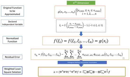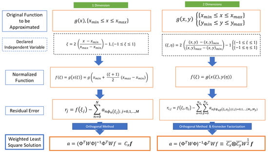To conclude this section, it is good to note that the previously discussed methods of orthogonal approximation, i.e., the use of least-squares approximation with Chebyshev polynomials alongside the Kronecker product trick, is implemented in the FEM approximation routine, specifically for the three-dimensional case in approximating Laplace’s gravitational differential equations. Figure 2 and Figure 3 summarize the steps taken in the approximation routine for the one-, two-, and n-dimension approximation routine.