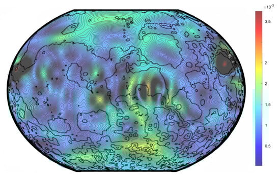 In the following discussion, we consider a basic orthogonal FEM approximation to a gravitational acceleration model determined from NASA’s Lunar Prospector (LP) mission in 100 spherical harmonic degrees [48]. Released in 2000, the LP Gravity model allows considerations of an analogous FEM approximation of the ‘LP100K’ gravity model. For high-precision orbit propagation, all terms used in the LP model are considered. Using this model, Laplace’s equation is solved for gravity using FEM and compared to the classical spherical harmonic approximations. Initially, a test was conducted to produce a contour plot of the disturbance gravity acceleration on a small degree order using the FEM approach. This test ensured a reasonable error value on top of a reasonable computation time, which encouraged us to continue the procedure with a higher degree order for an accurate representation. Figure 4 shows the radial disturbance acceleration on the lunar surface from the FEM representation with degree square using the N = 10 approximation.