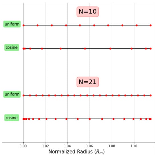 where and , and . At higher radii above the lunar surface, gravity anomalies decline rapidly. With this fact, we seek to format an efficient way to sample surface gravity that allows memory allocation. With cosine sampling, this transformation “naturally” constrains dense measurements at smaller radii, ensuring that gravity perturbations are maximized and mimic how gravity would naturally act. This means that no matter the number of points N at lower radii, these nodes then bunch up in comparison to larger radii. This idea is illustrated in Figure 5 for 10 and 21 sample points; compare this method to uniform sampling. To compact this progression, the transformed radius variable was created to help treat r as an independent variable. It is again important to note that is sampled non-uniformly using another cosine transformation in order to satisfy the Chebyshev orthogonality conditions: